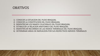 Este documento describe la anatomía del plexo braquial. El plexo braquial está formado por la unión de los cuatro últimos nervios cervicales (C5-C8) y el primer nervio torácico (T1). Incluye ramificaciones como el nervio musculocutáneo, nervio mediano y nervios colaterales. El documento detalla la formación, ramas y distribución de estos nervios, así como sus funciones motoras y sensitivas.
