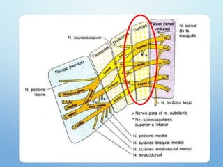 El plexo braquial es una estructura nerviosa localizada en la base del cuello y hueco axilar que proporciona inervación sensitiva, motora, vasoconstrictora y propioceptiva a la cintura escapular y extremidad superior. Está formado por las ramas anteriores de los nervios cervicales C5-T1. Estas ramas forman tres troncos primarios que luego se dividen en troncos secundarios y ramas terminales como el nervio axilar, radial, músculo cutáneo, mediano y ulnar, los cuales iner
