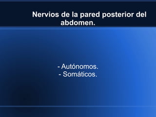 Este documento describe los nervios de la pared posterior y el plexo lumbar. Explica que los nervios somáticos de la pared posterior del abdomen incluyen los nervios subcostales y los nervios lumbares L1-L5. Estos nervios se originan en la médula espinal y emergen por los agujeros intervertebrales inferiores. El documento también describe el plexo lumbar formado por los nervios L1-L4 y los nervios que de él se originan, incluyendo el femoral, obturador, lumbosacro, ilioinguinal e iliohip