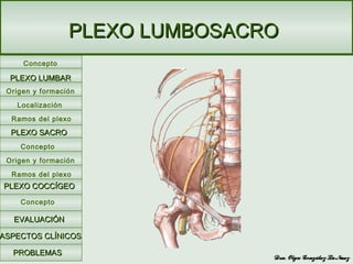 El documento describe los plexos lumbo-sacro, lumbar, sacro y coccígeo. El plexo lumbo-sacro se compone de los ramos ventrales de los nervios lumbares, sacros y coccígeos. Se divide en tres plexos particulares: lumbar, sacro y coccígeo. El plexo lumbar se forma por los nervios lumbares superiores y emite varios nervios como el femoral. El plexo sacro se forma por los nervios lumbares inferiores y sacros y emite el nervio ciático. El plexo coccígeo inerva la