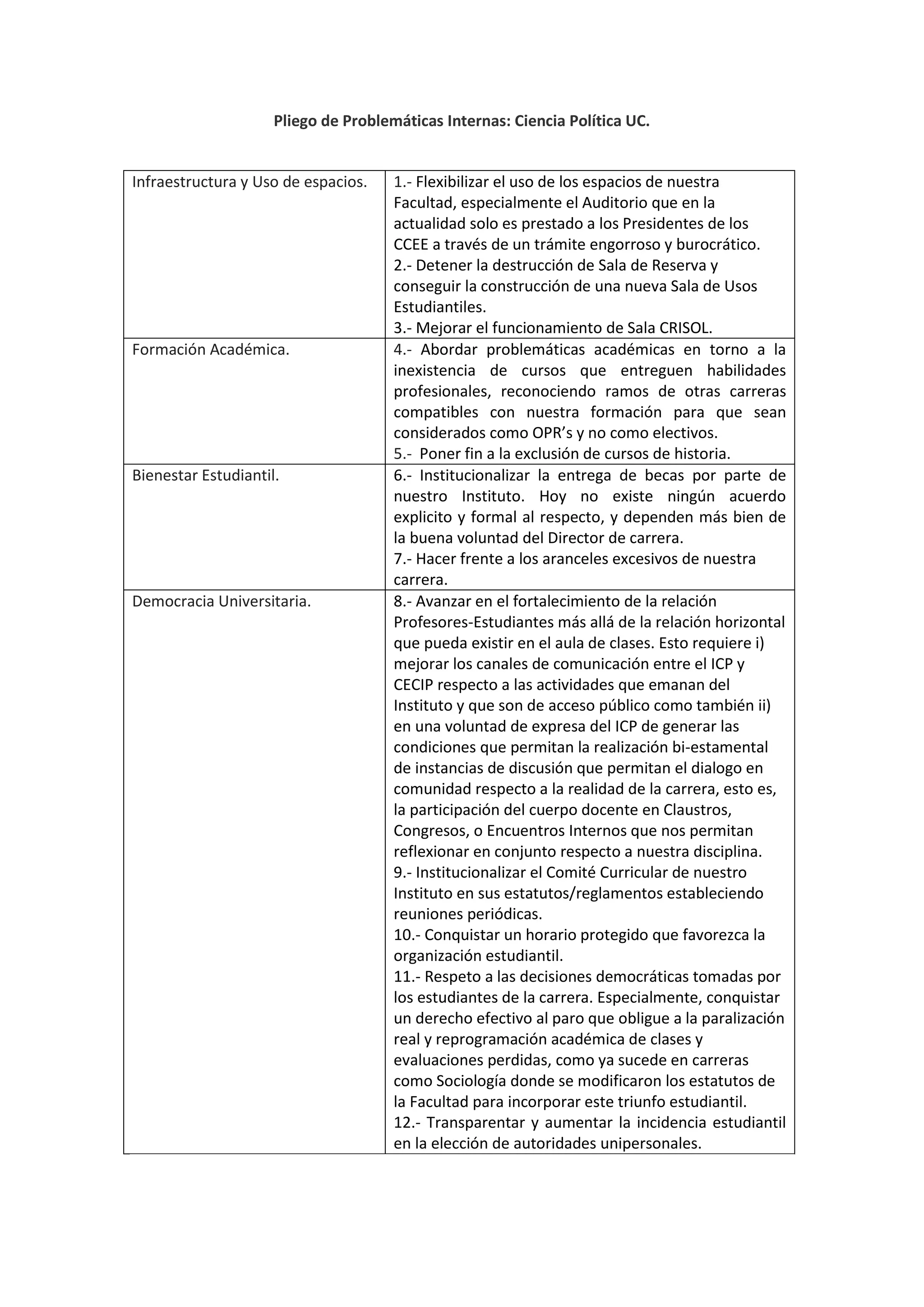 El documento propone 12 problemas internos relacionados con la infraestructura, formación académica, bienestar estudiantil y democracia universitaria en la Facultad de Ciencia Política de la Universidad Católica. Entre ellos, flexibilizar el uso del auditorio, mejorar el funcionamiento de la sala de usos estudiantiles, incorporar cursos que entreguen habilidades profesionales, institucionalizar becas estudiantiles, fortalecer la relación entre profesores y estudiantes, y respetar las decisiones democráticas tomadas por