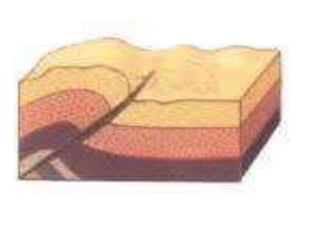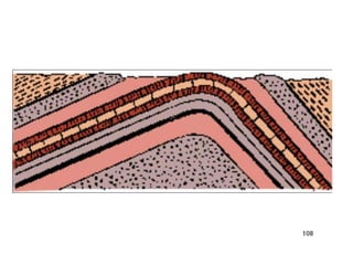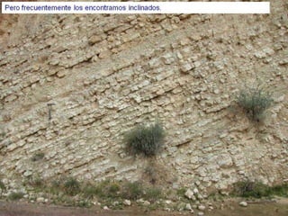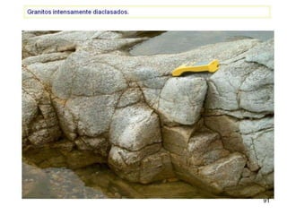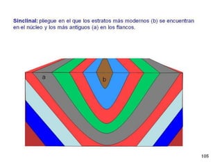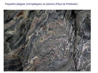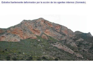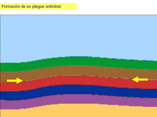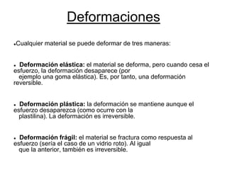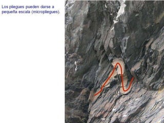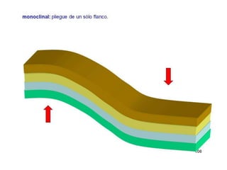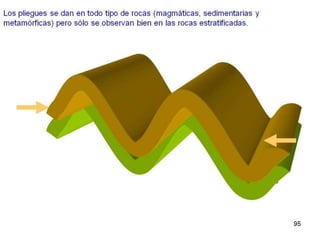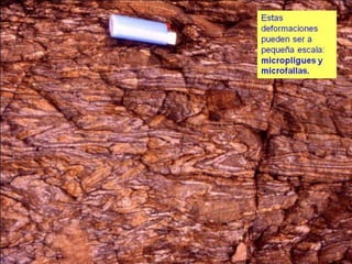 Este documento describe tres tipos de deformaciones que los materiales pueden sufrir: elástica, plástica y frágil. Cuando estas deformaciones ocurren en las rocas de la Tierra, dan lugar a estructuras como pliegues (doblamiento plástico), fallas y diaclasas (deformación frágil). Se explican los diferentes tipos de pliegues y fallas, incluyendo cómo se forman y sus características.