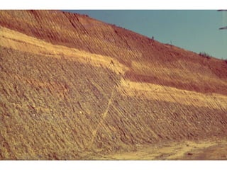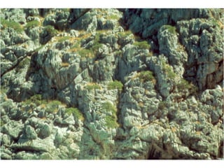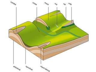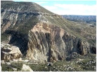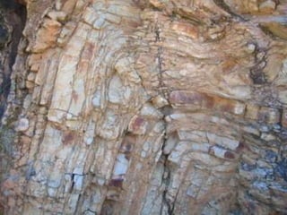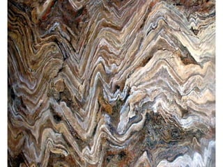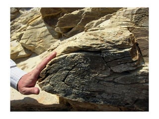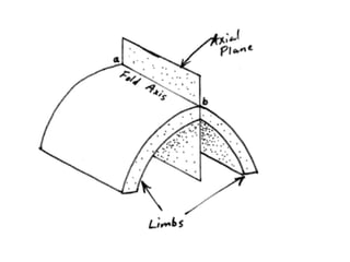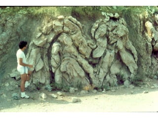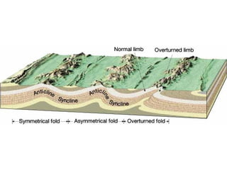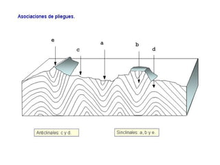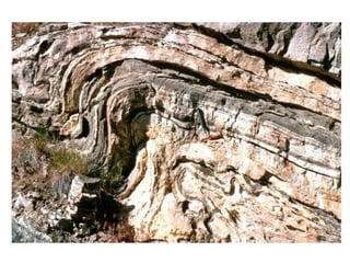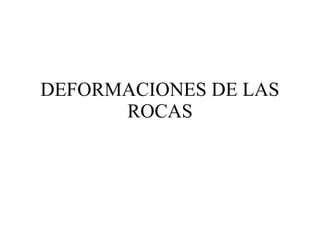 Este documento describe los diferentes tipos de deformaciones que pueden ocurrir en las rocas, incluyendo su comportamiento plástico o rígido. Explica que las fuerzas aplicadas a las rocas pueden causar pliegues o fracturas, y presenta los diferentes tipos de pliegues y fallas que se forman como resultado de estos procesos de deformación.