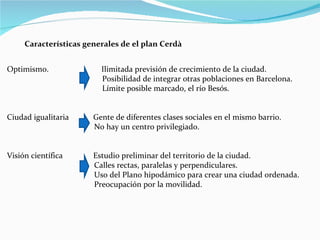 El documento resume las características principales del Plan Cerdà de 1859 para la expansión de Barcelona. El plan promovía una ciudad igualitaria y científicamente planificada con calles rectas y paralelas para una mejor movilidad y condiciones higiénicas. Las manzanas internas contarían con jardines y árboles para mejorar la calidad de vida de los residentes. Sin embargo, la especulación inmobiliaria y la oposición a la visión de Cerdà llevaron a modificaciones no planificadas del diseño original.