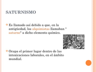 El documento describe las patologías asociadas a la exposición al plomo, incluyendo el saturnismo. El plomo puede causar lesiones neurológicas por contacto, ingestión o inhalación. Presenta fuentes contaminantes ocupacionales y ambientales. Los síntomas incluyen dolor abdominal, vómitos, estreñimiento, trastornos neuromusculares y del sistema nervioso central. El tratamiento implica retirar la exposición al plomo y administrar medicamentos como gluconato cálcico. Se recomiendan medidas preventivas