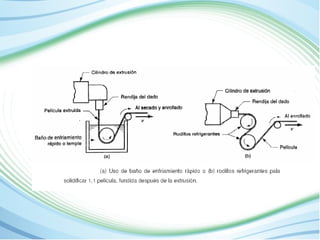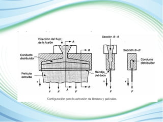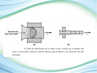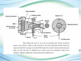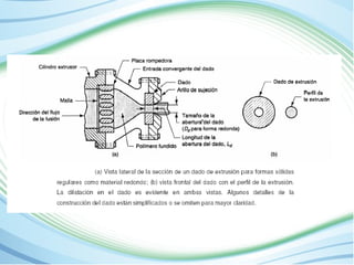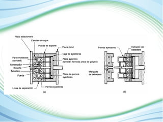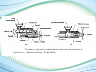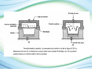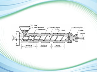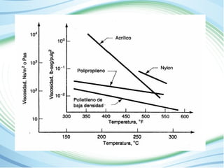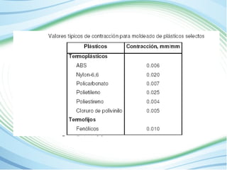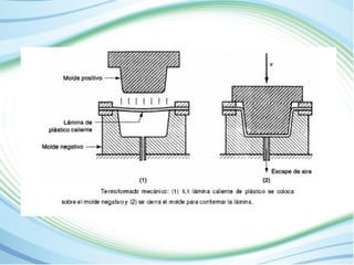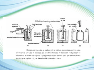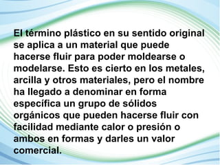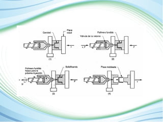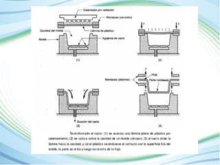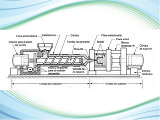 El documento describe los plásticos, sus propiedades y procesos de manufactura. Los plásticos ofrecen propiedades como bajo peso, aislamiento eléctrico y resistencia a la corrosión. Existen dos tipos principales: termoplásticos y termofijos. Los procesos de manufactura incluyen moldeo por inyección, extrusión, termoformado y otros. El moldeo por inyección produce piezas discretas mediante el flujo de plástico fundido a alta presión dentro de un molde.