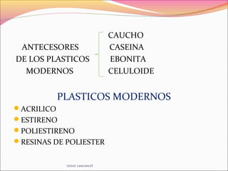 Este documento describe los diferentes tipos de plásticos utilizados en la construcción, incluyendo sus aplicaciones, características y ventajas. Explica los antecedentes de los plásticos modernos y clasifica los plásticos termoestables y termoplásticos. Luego detalla los principales plásticos como PET, PEAD, PVC, PEBD, PP y PS, sus usos comunes en la construcción y cómo cumplen normas aplicables.