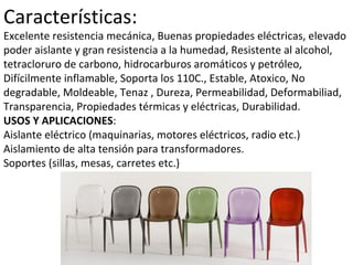 - El documento describe las características y usos de varios tipos de plásticos como el PET, PEAD, PVC, PEBD y PP. Presenta sus propiedades, ventajas y desventajas, usos frecuentes y ejemplos de diseños de sillas de plástico.