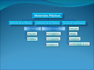 El documento proporciona una introducción a los materiales plásticos, incluyendo su definición, clasificación y principales técnicas de conformación. Explica que los plásticos están formados por polímeros de moléculas grandes como el PET, PVC, PEAD y PP. Luego clasifica los plásticos por su naturaleza (naturales o sintéticos) y estructura interna (termoplásticos, termoestables o elastómeros). Finalmente, resume las principales técnicas para dar forma a los plá