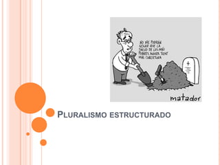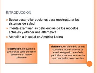 El documento describe los retos actuales de los sistemas de salud en América Latina y propone un nuevo modelo llamado "pluralismo estructurado". Actualmente los sistemas son segmentados y no coordinan bien las funciones de financiamiento, modulación, articulación y prestación de servicios. El pluralismo estructurado busca integrar a la población de forma horizontal y asignar funciones de manera explícita y especializada, con un énfasis en fortalecer la modulación a cargo de entidades neutrales. El objetivo es lograr un equilibrio entre