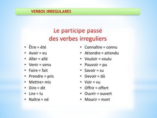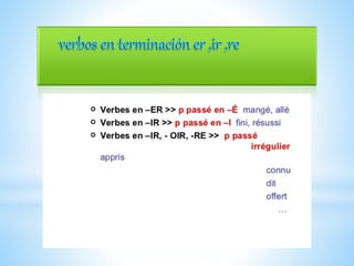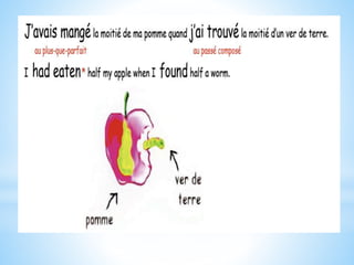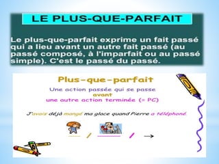 Este documento presenta información sobre el uso del plus-que-perfecto en francés. Explica cómo se forma este tiempo pasado y proporciona ejemplos de conjugación de los verbos auxiliares avoir y être en el imperfecto. También incluye enlaces a videos y ejercicios para que los estudiantes practiquen el uso del plus-que-perfecto.