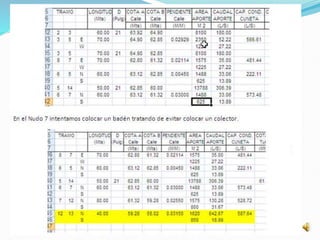 Este documento describe los conceptos y métodos para el diseño de un sistema de drenaje pluvial, incluyendo el uso de la fórmula racional para calcular caudales de escorrentía, el tiempo de concentración, los coeficientes de escorrentía, y los elementos del sistema como cunetas, badenes, imbornales y conductos. Explica que el objetivo es recolectar y transportar el agua de lluvia de manera segura desde su punto de generación hasta un cuerpo receptor.