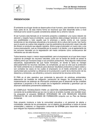 Este documento presenta el Plan de Manejo Ambiental del Complejo Tecnológico para la Gestión Agroempresarial. El plan tiene como objetivo principal crear conciencia ambiental en la comunidad educativa y desarrollar acciones para mitigar los impactos negativos en recursos como el suelo, agua y aire. El plan busca realizar un diagnóstico ambiental, establecer objetivos a corto y largo plazo, y generar alternativas para mejorar el desarrollo de las actividades de la institución de una manera más sosten
