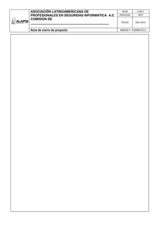 El documento presenta el acta de cierre de un proyecto realizado por la Asociación Latinoamericana de Profesionales en Seguridad Informática, detallando la identificación, descripción, fechas de inicio y término, y una lista de entregables concluidos. También incluye una relación de documentos administrativos, observaciones finales sobre el proyecto y la firma de aceptación por los responsables involucrados. Se menciona la importancia de verificar todos los soportes documentales y compromisos contractuales pendientes antes de finalizar el proyecto.