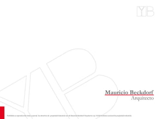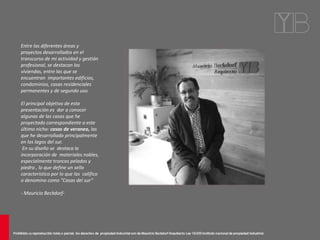 El documento presenta una selección de proyectos de casas de veraneo diseñadas por el estudio Mauricio Beckdorf en los lagos del sur de Chile. Las casas se caracterizan por el uso de materiales nobles como troncos pelados y piedra, y por ofrecer espacios amplios y luminosos. El documento incluye descripciones y especificaciones técnicas de varias casas proyectadas en lagos como Ranco, Villarrica, Panguipulli y Huenehue.