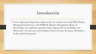 El documento compara el PMBOK y el PMI. El PMBOK se enfoca en las áreas y procesos clave de gestión de proyectos, mientras que el PMI es una organización internacional que promueve la profesionalización de la gestión de proyectos a través de la certificación. Ambos buscan mejorar el éxito de los proyectos pero se dirigen a audiencias diferentes, siendo el PMBOK más para ejecutivos y el PMI para todos los involucrados en proyectos.