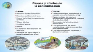 1) El documento describe varios temas relacionados con el desarrollo sustentable, incluyendo las causas de deterioro ambiental como la agricultura comercial y de subsistencia, el surgimiento de ciudades y la actividad minera, así como los efectos de la contaminación.