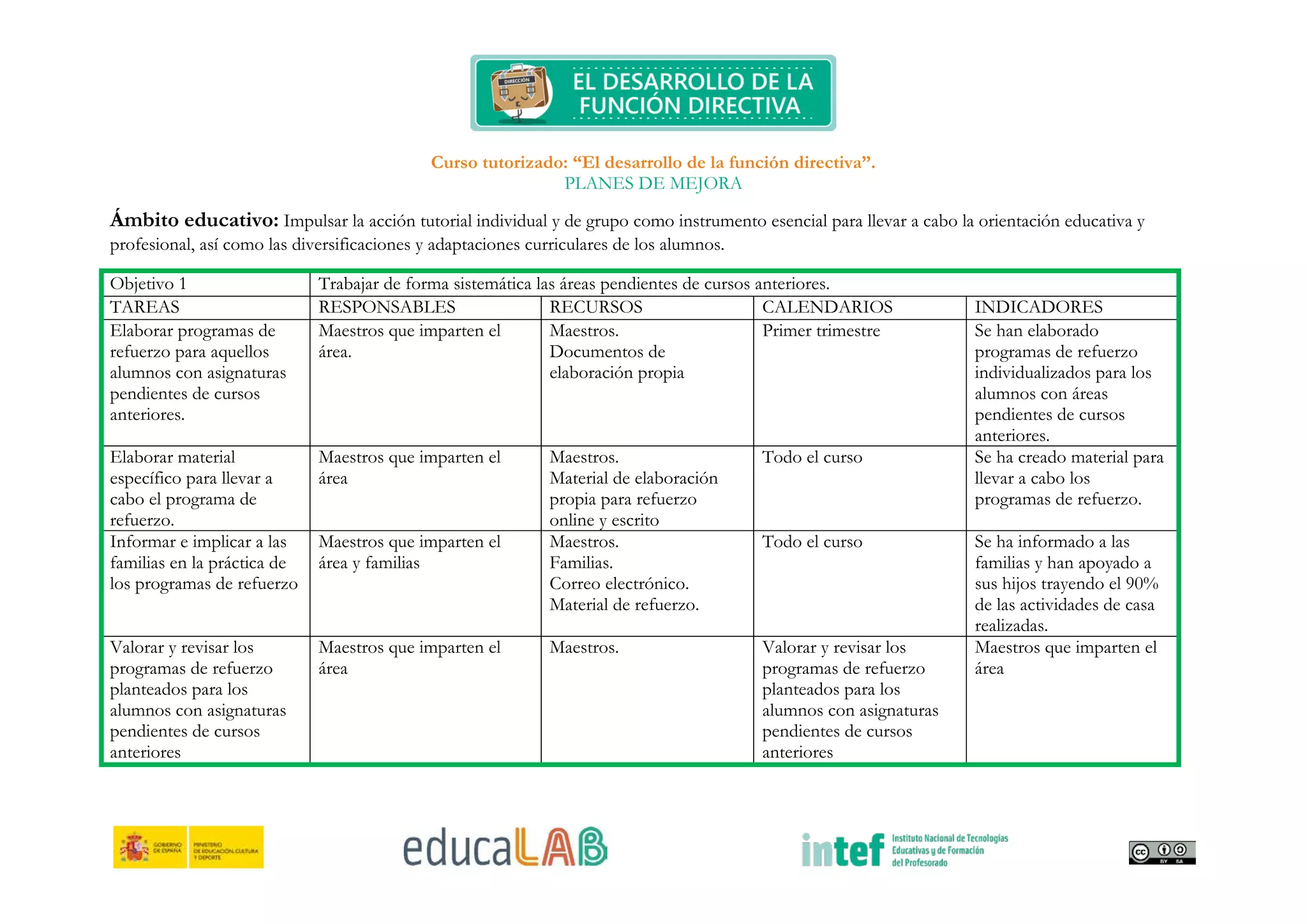 Este documento presenta varios planes de mejora para un curso tutorizado sobre el desarrollo de la función directiva. Los planes incluyen objetivos y tareas para mejorar la acción tutorial, el trabajo en equipo del profesorado, la evaluación, la organización del centro, la expresión escrita y oral de los estudiantes.