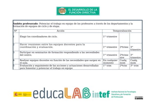 Este documento presenta varios planes de mejora para diferentes ámbitos de un centro educativo. Propone acciones para impulsar la orientación tutorial y educativa de los alumnos, potenciar el trabajo en equipo del profesorado, hacer de la evaluación un instrumento de motivación, mantener relaciones con otras instituciones, diseñar un plan de biblioteca y crear una red digital para la comunicación con la comunidad educativa. Las acciones se desarrollarían durante los tres trimestres del curso escolar.