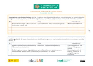 Este documento presenta varios planes de mejora para diferentes ámbitos de un centro educativo. Se proponen acciones como impulsar la orientación individual y de grupo de los alumnos, potenciar el trabajo en equipo del profesorado, hacer que la evaluación sea un proceso de motivación y mejora, mantener relaciones con instituciones externas, establecer medidas para la conservación de recursos TIC, y acercar a las familias a la vida del centro a través de una jornada de convivencia. Las acciones tienen asignadas temporalizaciones que van desde reunion