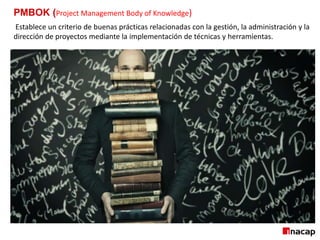 Este documento resume el PMBOK (Project Management Body of Knowledge), las 9 áreas de conocimiento de gestión de proyectos establecidas por el PMBOK, y la función del Project Management Institute (PMI). El PMBOK establece las mejores prácticas para la gestión y dirección de proyectos a través de técnicas y herramientas. El PMI promueve la gestión de proyectos como profesión a través de programas de certificación y la generación de conocimiento.