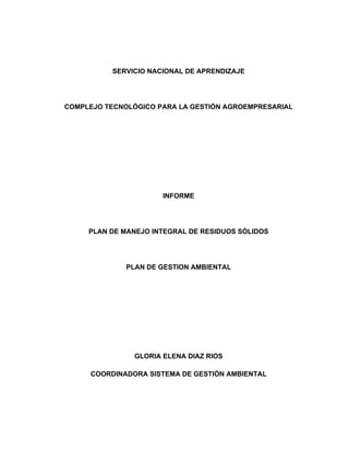 Este documento presenta el Plan de Manejo Integral de Residuos Sólidos del Servicio Nacional de Aprendizaje (SENA) con el objetivo de formular e implementar un plan que permita la gestión adecuada de los residuos generados. Se describen los antecedentes del SENA, el marco legal aplicable, la clasificación y características de los residuos, y los programas propuestos para la prevención, separación, almacenamiento, recolección, tratamiento y disposición final de los residuos de una manera integral que cumpla con la norm
