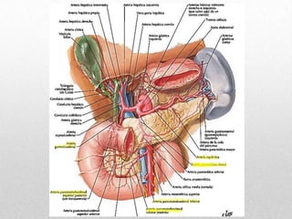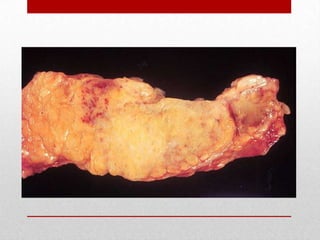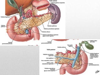 El páncreas es una glándula digestiva alargada situada retroperitonealmente que secreta enzimas digestivas y hormonas. Se divide en cabeza, cuello, cuerpo y cola. Produce jugo pancreático que se vierte en el duodeno a través del conducto pancreático principal y hormonas como la insulina. Las enfermedades comunes incluyen la pancreatitis aguda hemorrágica y el cáncer de páncreas.