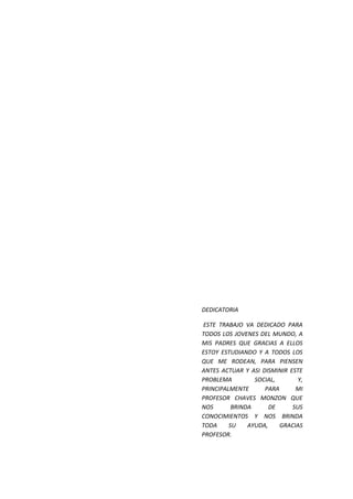 El documento describe el maltrato infantil como un problema social creciente y sus causas como el consumo de drogas y alcohol, la irresponsabilidad y la falta de comunicación. Aplica la metodología de sistemas suaves para definir el problema, identificar sus causas y consecuencias, y proponer soluciones como brindar orientación familiar, mejorar la comunicación y alejarse de influencias negativas. El documento concluye resaltando