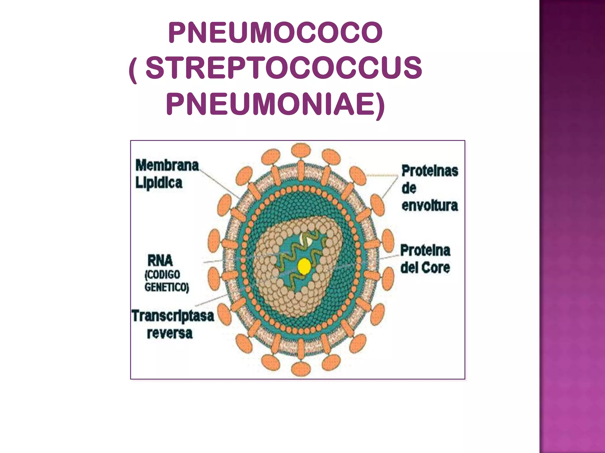 Este documento describe las características de los neumococos (Streptococcus pneumoniae). Son cocos Gram positivos que se agrupan en pares o cadenas cortas, son inmóviles y capsulados, y crecen a 37°C en un pH entre 7.4-7.8. Su hábitat es el sistema respiratorio humano y se transmiten por gotas respiratorias. Pueden causar infecciones como neumonía, meningitis y sinusitis.