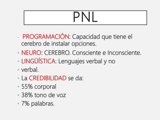 La Programación Neurolingüística (PNL) busca adquirir patrones de excelencia modelando a personas exitosas. Se originó en 1974 cuando John Grinder y Richard Bandler modelaron a terapeutas como Virginia Satir, Fritz Perls y Milton Erickson. La PNL representa el mundo a través de sistemas visuales, auditivos y sensoriales que se identifican mediante accesos visuales, palabras y movimientos. Permite calibrar el estado interno de los demás a través de micro movimientos y establecer sintonía comunicándose en su canal preferido