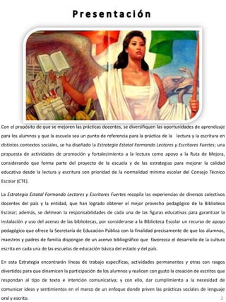 Este documento presenta la Estrategia Estatal "Formando Lectores y Escritores Fuertes" diseñada para mejorar las prácticas docentes y oportunidades de aprendizaje de los estudiantes en Tamaulipas, México. Describe líneas de acción como el uso de bibliotecas escolares y de aula, vinculación curricular de actividades de lectura y escritura, y promoción de la lectura en familia. También presenta roles de directores, maestros, comités de lectura y padres de familia para implementar