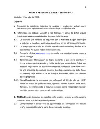 Este documento presenta las tareas y actividades propuestas en una sesión de formación de profesores sobre lectura y escritura. Incluye referencias sobre técnicas de escritura creativa y producción textual. También presenta cuatro producciones escritas cortas como ejemplo de una actividad sobre el monstruo del lago Ness. El resumen concluye con una introducción a una historia personal sobre una experiencia de lectura durante la infancia.