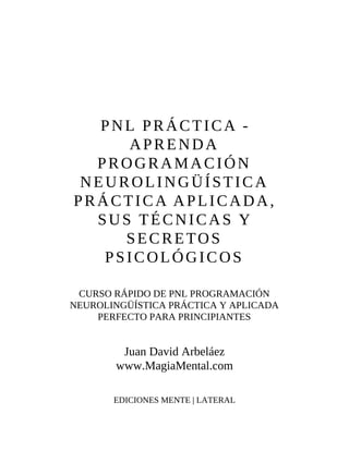 Este documento presenta un curso rápido de Programación Neurolingüística (PNL) dirigido a principiantes. Explica brevemente qué es la PNL y sus pilares, y promete enseñar técnicas prácticas de PNL como transformar recuerdos, generar hábitos, utilizar el lenguaje corporal y palabras poderosas. El autor afirma que compartirá las herramientas más útiles de la PNL de manera condensada y fácil de aplicar, sin información innecesaria.