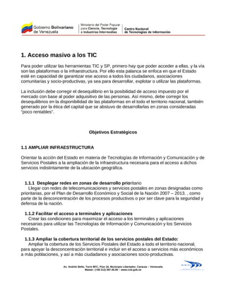 El documento presenta el Plan Nacional de Telecomunicaciones, Informática y Servicios Postales de Venezuela para el período 2007-2013. El plan tiene cinco líneas generales: 1) Acceso masivo a las TIC, 2) Soberanía e independencia tecnológica, 3) Transformación del Estado, 4) Uso de las TIC para el desarrollo, y 5) Modelo comunicacional inclusivo. El objetivo es garantizar el acceso universal a los servicios TIC y postales para todos los ciudadanos, reducir la dependencia tecnológica y promover