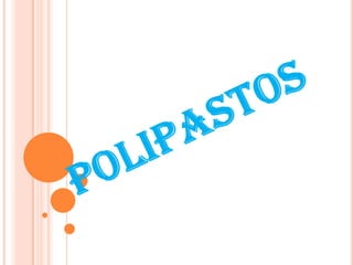 Este documento describe los polipastos, que son maquinarias utilizadas para levantar o mover objetos pesados. Explica que están compuestos de poleas fijas y móviles, y cuerdas que transmiten las fuerzas. Las poleas fijas cambian la dirección de la fuerza aplicada, mientras que las poleas móviles proporcionan una ganancia mecánica de 2 por cada polea. También enumera algunas herramientas comunes de los polipastos como engranajes, frenos y contadores.