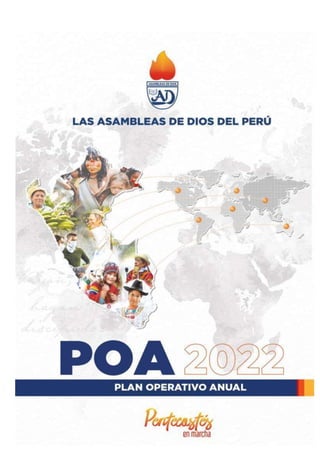 El documento resume la situación actual del contexto peruano y de la iglesia LADP. Describe los avances y desafíos en áreas como la identidad asambleísta, la educación, la salud de las iglesias, la gestión, las misiones y la proyección social. Aún queda trabajo por hacer en fortalecer la identidad, mejorar la capacitación de líderes, implementar proyectos de impacto social y apoyar a familias y miembros afectados por la pandemia y desastres naturales. Propone proyectos para 2022