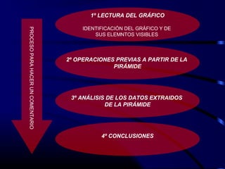 Este documento proporciona instrucciones para analizar y comentar una pirámide de población en 4 pasos: 1) lectura e identificación de los elementos de la pirámide, 2) operaciones previas como calcular años de nacimiento y dividir la población en grupos, 3) análisis de los datos extraídos incluyendo formas de la pirámide y distribución por sexo y edad, 4) conclusiones sobre la evolución pasada y proyecciones futuras. El objetivo es extraer información demográfica clave de la pirám