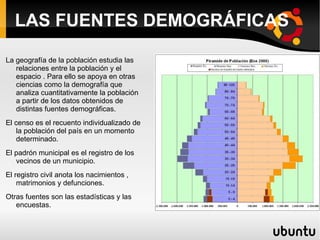 El documento habla sobre la población española y las fuentes demográficas. Explica que el censo, el padrón municipal y el registro civil son fuentes importantes de datos demográficos. También analiza las características de la distribución espacial de la población en España y los movimientos naturales y migratorios de la población, incluyendo las migraciones interiores y exteriores tradicionales.