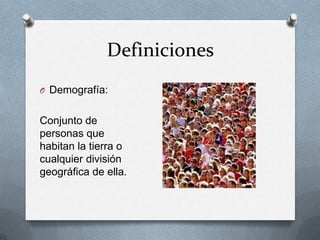 El documento define el concepto de población estadística como el conjunto de elementos sobre el cual se realiza una investigación. Se clasifica en población finita, con elementos limitados, y población infinita, con una cantidad extensa de elementos. También se mencionan definiciones de demografía y biología en relación con poblaciones.