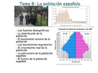 El documento analiza la población española desde diversas perspectivas, incluyendo su estructura demográfica, movimientos migratorios, y el crecimiento natural. Se abordan temas como la distribución de la población, el impacto de la inmigración y la evolución demográfica desde 1960, así como los desequilibrios territoriales en tasas de natalidad y mortalidad. También se incluyen herramientas como gráficos y mapas para ilustrar las tendencias demográficas y su relación con factores económicos y sociales.