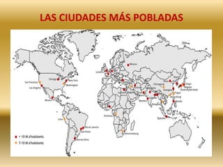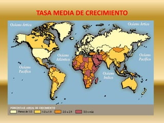 El documento describe la evolución de la población mundial a lo largo de la historia. Comenzó con solo 125,000 personas hace un millón de años y ha crecido exponencialmente desde entonces, alcanzando los 6,000 millones a finales del siglo XX. El crecimiento se ha acelerado con la revolución industrial y los avances médicos, y la población ahora se duplica cada 40 años. También analiza tasas de natalidad, mortalidad y densidad poblacional, así como las ciudades más pobladas del mundo.