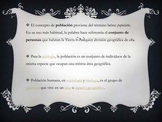 La población se refiere al conjunto de individuos de una especie que habitan en un área. Las características clave de una población incluyen su densidad, distribución por edad y espacio, proporción de sexos, tasas de natalidad y mortalidad, curvas de sobrevivencia y migración. Estas características afectan el crecimiento y cambios de una población a través del tiempo.