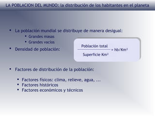 La distribución desigual de la población mundial depende de factores físicos, históricos y económicos. La densidad de población se calcula dividiendo el número total de habitantes entre el área en km2. La evolución de la población mundial depende de la natalidad, mortalidad y migraciones, y ha pasado de 500 millones en el año 1650 a más de 7000 millones actualmente.