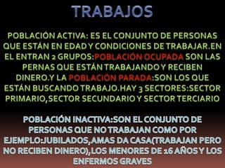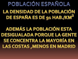 Este documento describe las características de la población y la economía de Europa y España. En Europa, el 30% trabaja en el sector secundario como la metalurgia y maquinaria, mientras que el 66% trabaja en el sector terciario como el comercio, transporte y turismo. En España, los cultivos más extendidos son los del Mediterráneo, y en el norte destaca la ganadería bovina. Las industrias metalúrgicas y de bienes de consumo emplean a más personas en el sector secundario español.