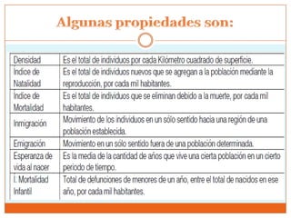 La dinámica de poblaciones estudia los cambios en el tamaño, estructura y parámetros de poblaciones biológicas, y los factores ambientales que causan estos cambios. Una población se define como un conjunto de organismos de la misma especie que coexisten en un espacio y tiempo compartidos. El crecimiento de una población depende de la natalidad, mortalidad y migración. Factores como el clima, recursos y otras poblaciones pueden limitar el crecimiento de una población.