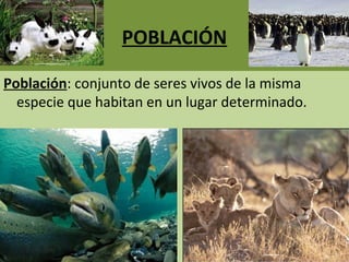El documento describe los conceptos clave relacionados con las poblaciones de seres vivos, incluidas las tasas de natalidad y mortalidad, el potencial biótico, la resistencia ambiental y la capacidad de sostenimiento. Explica que el crecimiento de la población puede ser ilimitado en forma de J o en forma de S cuando los recursos son limitados, alcanzando un límite máximo llamado capacidad de sostenimiento debido a la resistencia ambiental. También incluye un enlace a un video que proporciona más información.