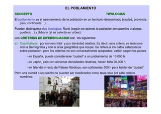 El documento resume los conceptos de poblamiento rural y urbano, así como sus principales características y diferencias. El poblamiento rural se caracteriza por una baja densidad demográfica, actividades relacionadas con el sector primario, edificios bajos y calles estrechas. El poblamiento urbano tiene una alta densidad demográfica, actividades terciarias y secundarias, edificios altos, calles amplias, y una gran extensión territorial y área de influencia. Los criterios cualitativos son los más importantes para difer