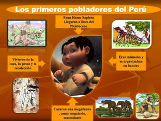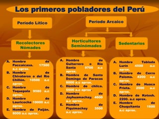 Los primeros pobladores del Perú llegaron hace aproximadamente 17,500 años a. C. y eran cazadores-recolectores nómadas. A lo largo de los períodos Lítico y Arcaico se produjo la transición hacia la agricultura, la domesticación de animales y el sedentarismo. Algunas de las culturas más importantes de este período fueron Chavín, Paracas, Nazca, Moche y Recuay.