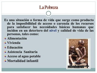 El documento describe las causas y consecuencias de la pobreza, incluyendo la falta de acceso a necesidades básicas como alimentos, vivienda y atención médica. Discute cómo la pobreza puede conducir a problemas sociales como el crimen, la prostitución y el abuso infantil. También analiza las diferencias entre los países desarrollados y subdesarrollados, y cómo factores como el desempleo, la falta de educación y el crecimiento demográfico contribuyen a la pobreza en todo el mundo.