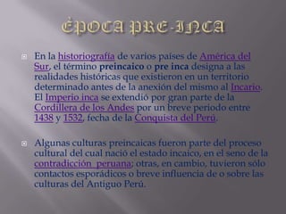 ÈPOCA PRE-INCAEn lahistoriografía de varios países de América del Sur, el término preincaico o pre incadesigna a las realidades históricas que existieron en un territorio determinado antes de la anexión del mismo al Incario. El Imperio inca se extendió por gran parte de la Cordillera de los Andes por un breve periodo entre 1438 y 1532, fecha de la Conquista del Perú.Algunas culturas preincaicas fueron parte del proceso cultural del cual nació el estado incaico, en el seno de la contradicción peruana; otras, en cambio, tuvieron sólo contactos esporádicos o breve influencia de o sobre las culturas del Antiguo Perú.